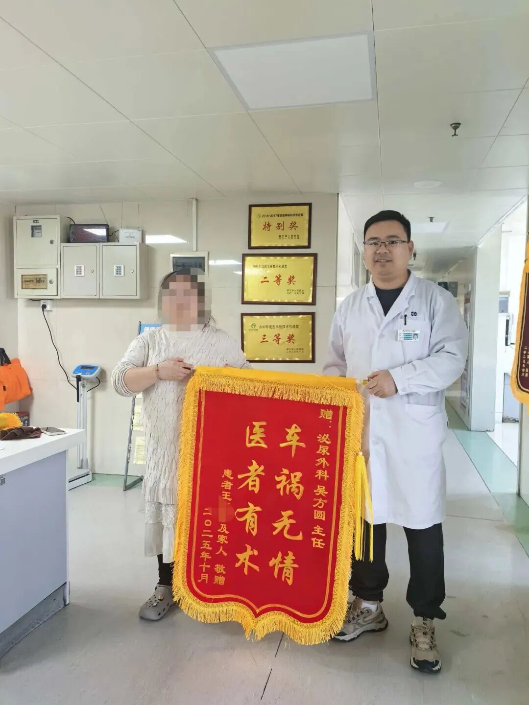 10月29日上午8时30分,医院上演暖心一幕。患者王某的女儿手捧七面鲜红的锦旗,逐一送到参与急救的七位医生手中。“感谢每一位救命恩人!没有你们,我父亲就没了!”锦旗上“妙手回春”“医者仁心”等字样,诉说着家属的无尽感激。
