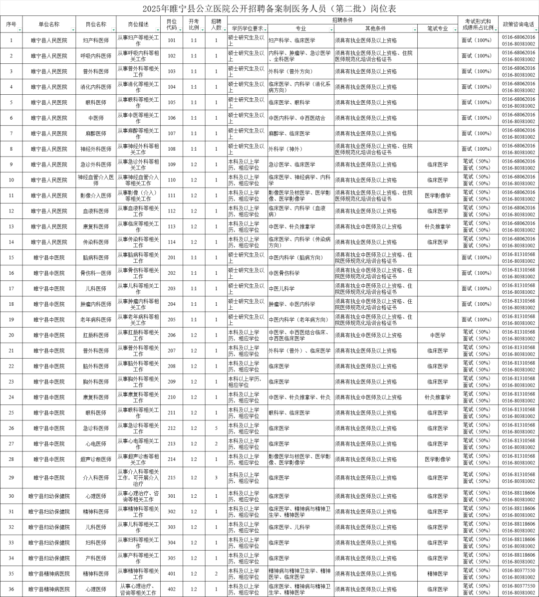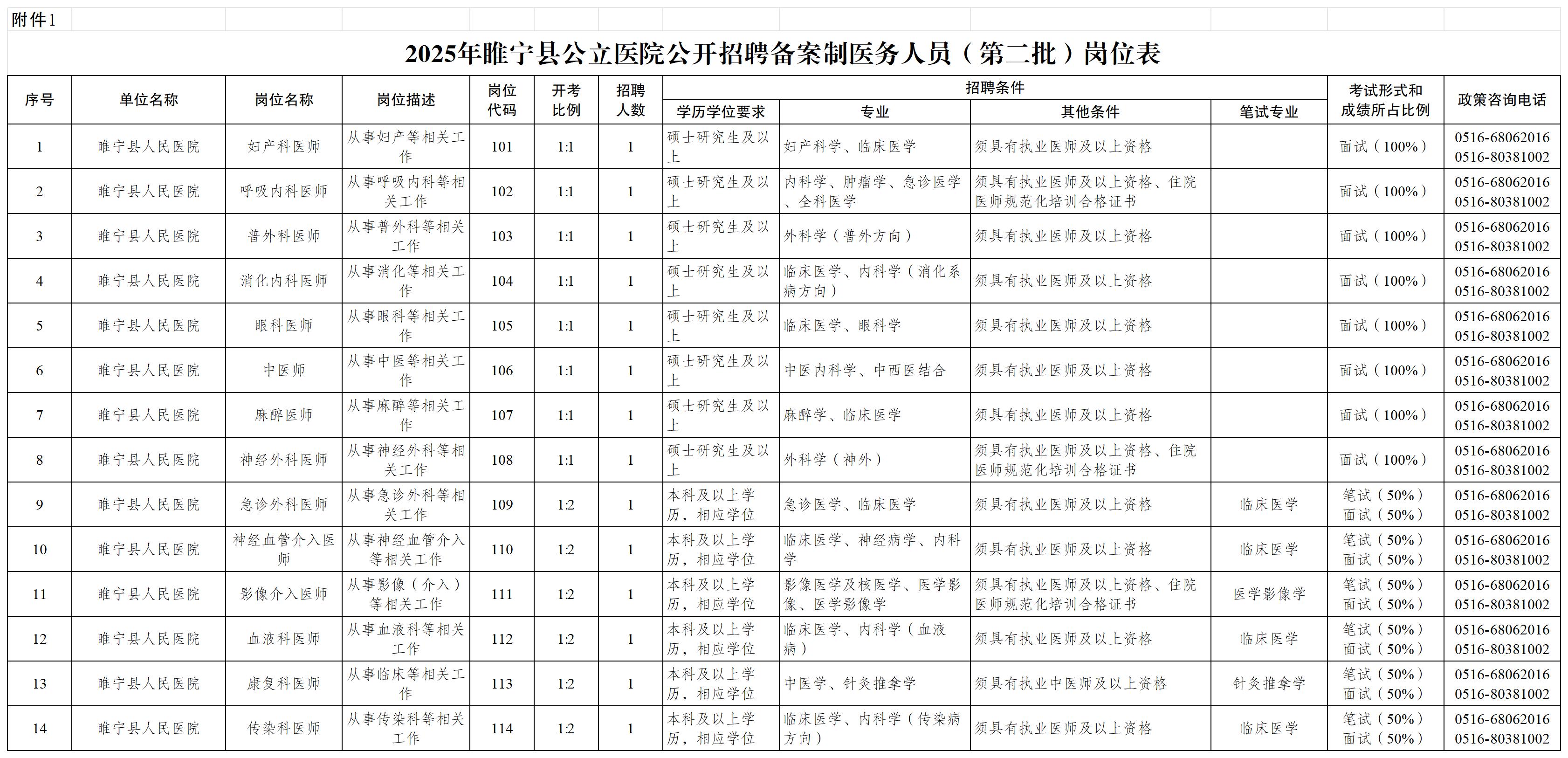 1. 2025年睢宁县公立医院公开招聘备案制医务人员(第二批)岗位表
